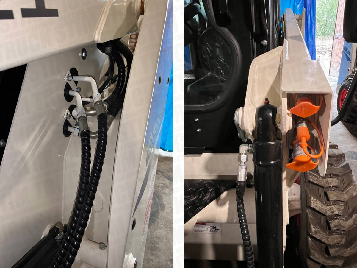 На Lonking CDM307 установлена универсальная быстросъемная плита стандарта SSL (Bob-Tach). Это позволяет подключать более 50 видов навески: паллетные вилы, щетки с поливом, снегороторы, экскаваторные рукояти и дорожные фрезы от любых производителей (Metallefach, Impulse, Delta и др.) без доработки гидролинии.
